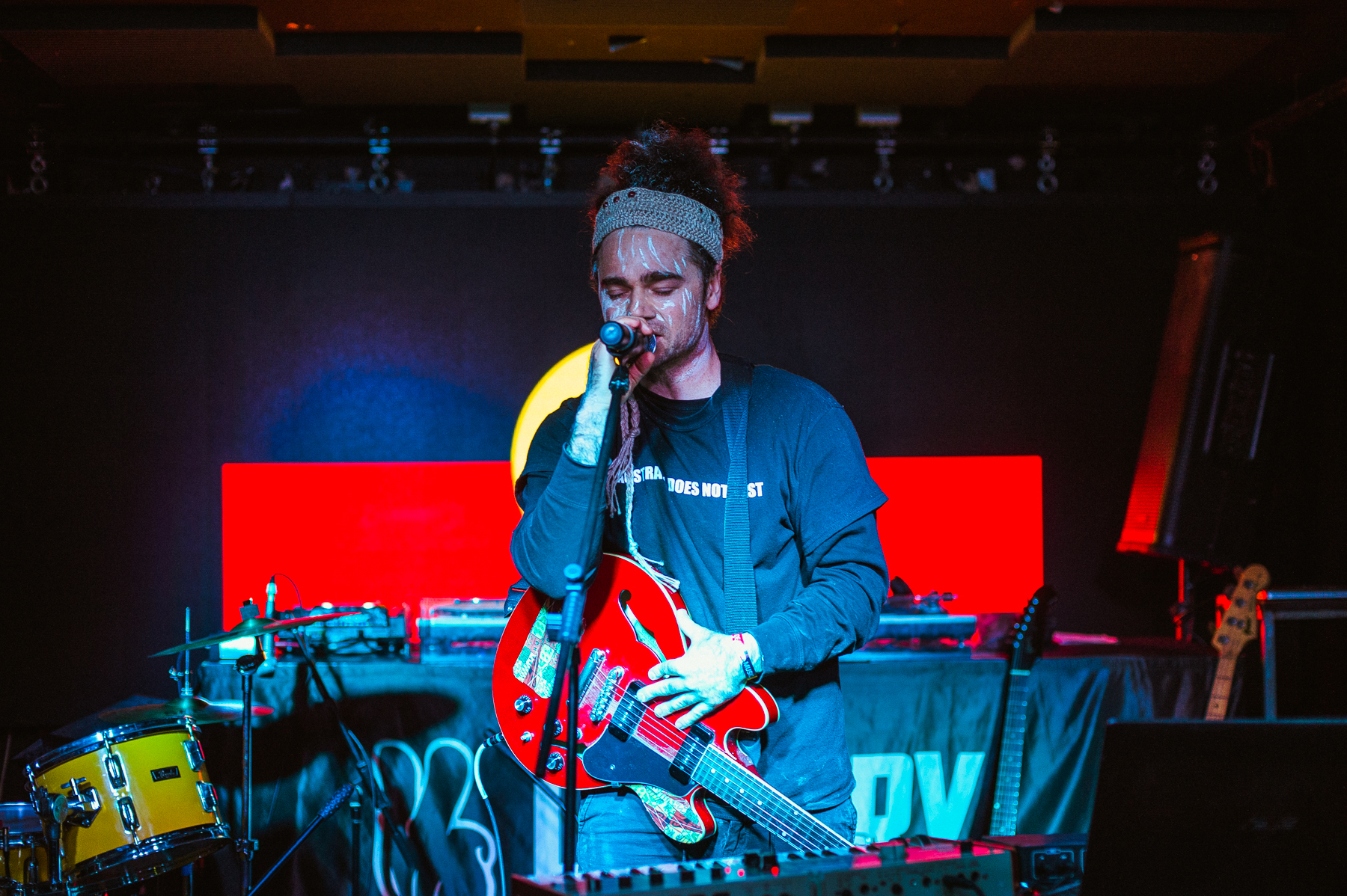 Muniak Nangarna is a watershed moment for Morris’s sonic career. It marks a key creative milestone in the evolution of his practice which remains deeply rooted in his Yorta Yorta identity. His own creative process has always existed outside of the so-called genres artists are forced into with their music. However Morris’s move into soundscapes illustrates how his sonic practice and Yorta Yorta culture is inextricably linked, regardless of whether he scores traditional Aboriginal instrumentation in his compositions. It’s no surprise to me that he’s entered this new mode. His channelling of frequencies seems to come to him from an original ancestral energy source not of this physical world. Indigenous hip hop practitioners have this innate ability to continually move the genre forward in a way which keeps adding to the cannon. They’ve always been at the forefront of innovation in this genre and like Morris’s work, fluidly move between musical expressions. By immersing the audience in this performance, Morris openly challenges their expectations and assumptions of what an Indigenous artist creates. He personifies his relationship and custodianship to Country through the utilisation of analogue synths, which manage to capture all the facets of Country despite being manufactured sounds.