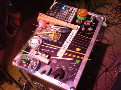 The Cable# show exemplified for me the crucial role of the audience to both physically impact an acoustical space and subsequently infect the aesthetic character of the sound. In terms of content, the concert was, for that period, characteristically dense: boisterous and chaotic, with rapid-fire exchanges in phrasing across instruments, driven more by the combined aleatoric possibilities of the preparations and extended techniques we were using than any premeditated response or formulated embellishment, such was the velocity of the music. But at the same time, precisely because of the proximity of the audience, and their collective capacity to distillate the sound, subtle details emerged. The resolution to the final piece we played involved the prolonged manipulation of an enamel camping plate (one of my favourite instruments — as you slowly bend it, the enamel coating fractures, flakes and splits from the malleable tin body in random, self-generating bursts, producing an intense effect that sounds like multiple bone fractures or fireworks). For reviewer, Split Foster: