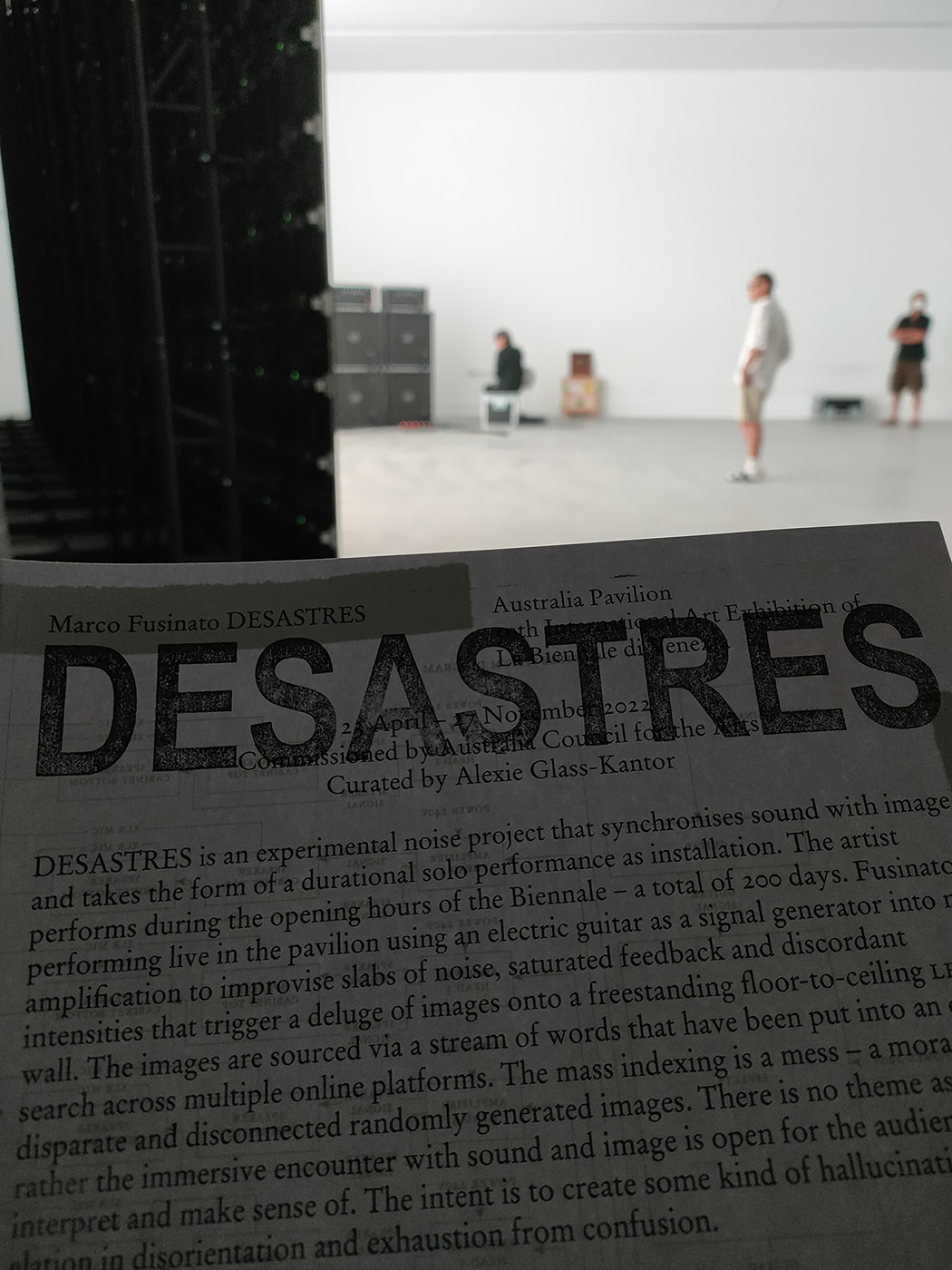 DESASTRES belongs to the underground world of noise and experimental music. But in Venice, it has been given a terrestrial stage. Biennale visitors run in and out, phones already filming in anticipation of the noise they have heard from outside. But their panoramic phone recordings are quickly saturated and overwhelmed by the volume of sounds and images. In this battle for primacy between the phone screen, and the work itself, DESASTRES is victorious. DESASTRES haemorrhages visitors, sometimes two thousand per day, a constant flow of human traffic in and out. This human traffic has an industrial soundtrack, a pulsating noise which tears at the floor like excavating machinery, or a fishing trawler scraping the seabed, chasing visitors out. At times the harmonics suggest helicopter rotor-blades coming at you from either side of the ceiling. Purposely or otherwise, the audience contributes to what is heard and felt. The blackbox that is the Australian Pavilion actively sculpts the sound; where you sit or stand, a corner, or with your shoulder blades pressed against the wall greatly impacts the experience. Fragments of noise feedback on themselves, recalling works such as Alvin Lucier’s I Am Sitting in a Room (1969), where a signal is transformed, de- and rematerialised through the process of capturing and recapturing resonant frequencies that have been sculpted by physical things; architecture, people, equipment and so on. All frequencies fed back through the speakers with new slabs of noise always following.