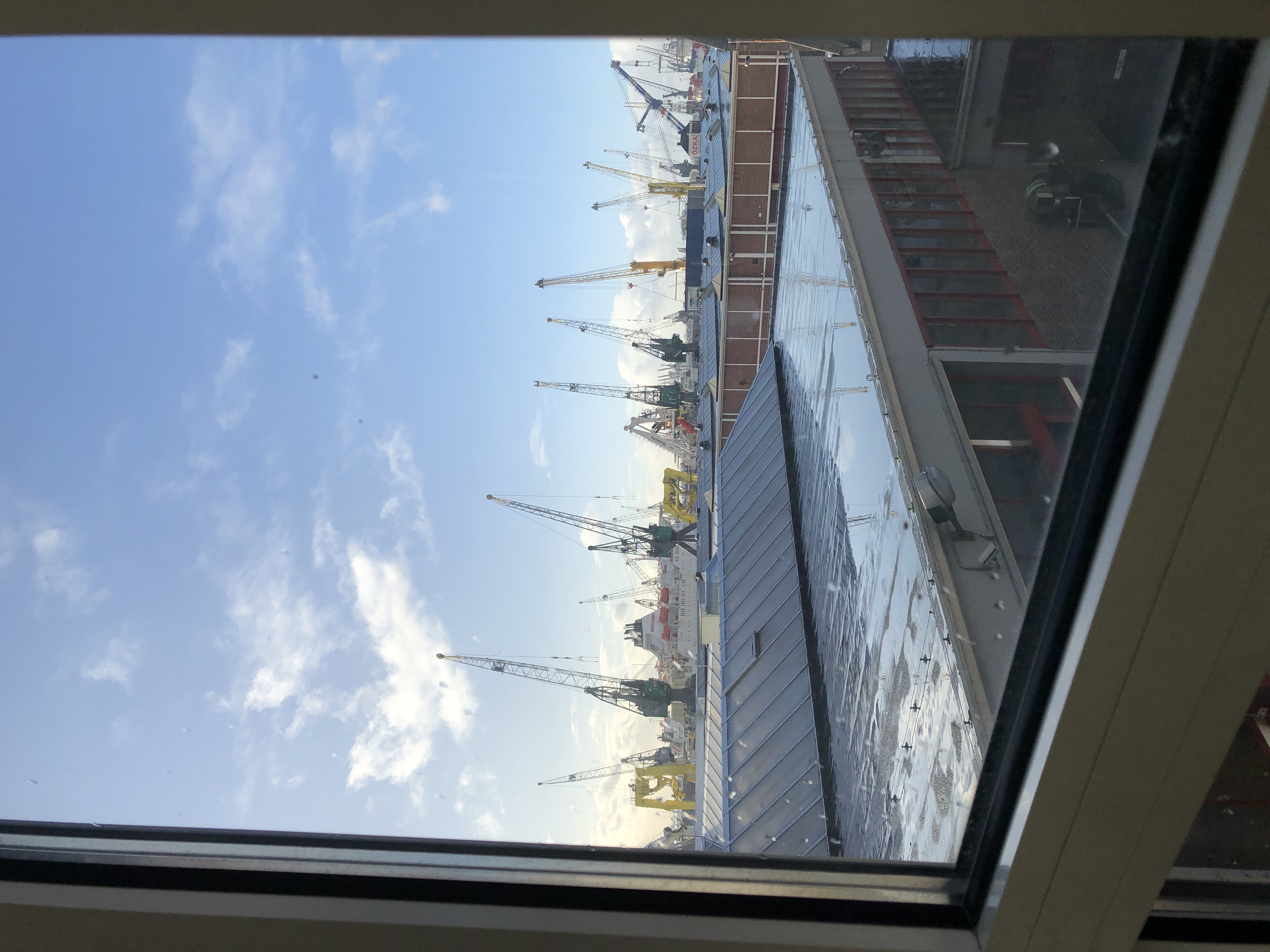 Phone snapshot by Pris Roos taken 19 November 2020 in Shimmer gallery, Rotterdam. I see a green crane in the distance. Three even, no wait four green cranes.