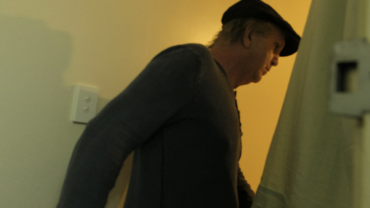 that man w/ serial-killer-hair: a circular saw in one hand and a case of Tooheys New in the other, at the end of a sinewy plastic frame