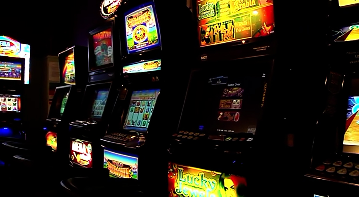 cabin and chairs overflowing with newspapers, clothes, and faux casino slots in torn divorce-bags