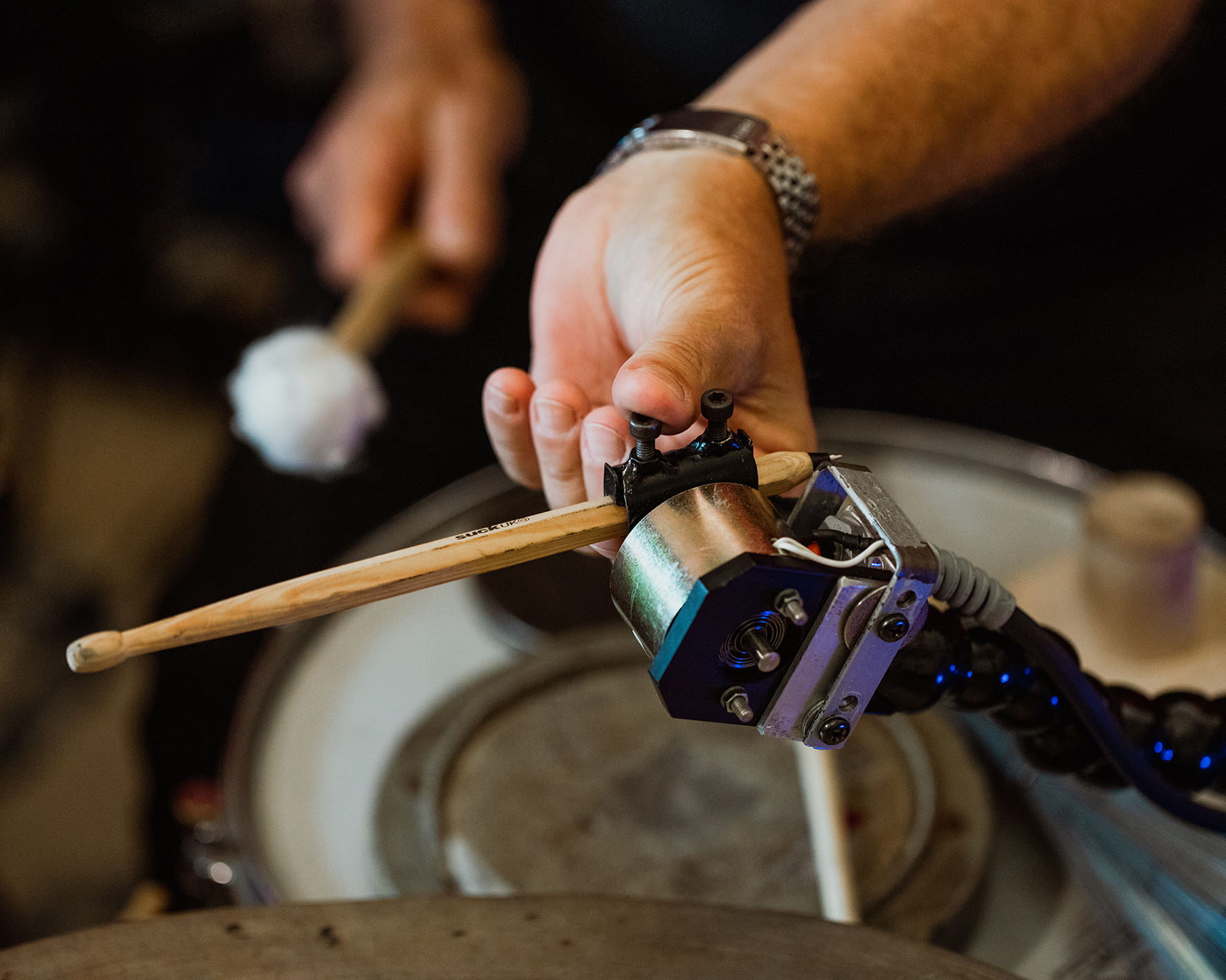 I first encountered Robbie Avenaim’s machine augmented percussion at the now legendary Lanfranchi’s Memorial Discotheque in Chippendale, Sydney. It was sometime in the early 2000’s and Robbie was drumming. As a failed drummer myself, I’m always drawn to percussion and Robbie has long been one of my all-time favourites. But this time he seemed to be eclipsing even my high expectations. He was playing with what appeared to be superhuman, effortless speed. His signature long cooking chopsticks zinging across skins and rims in what I thought was the most astounding display of virtuosity. As it happens, he had attached vibrating motors to the bottom of the sticks (they were hidden in his hands) and he was in fact guiding them. What I had perceived as super-human technique was an extra-human kinetic mechanism.