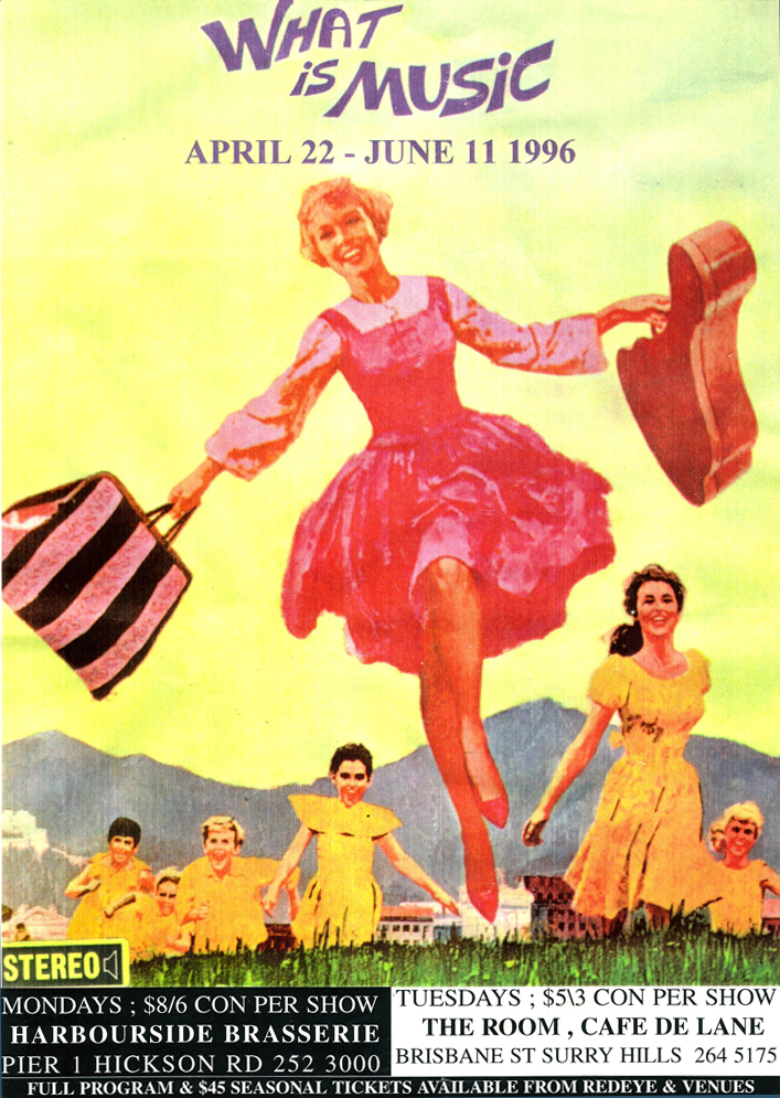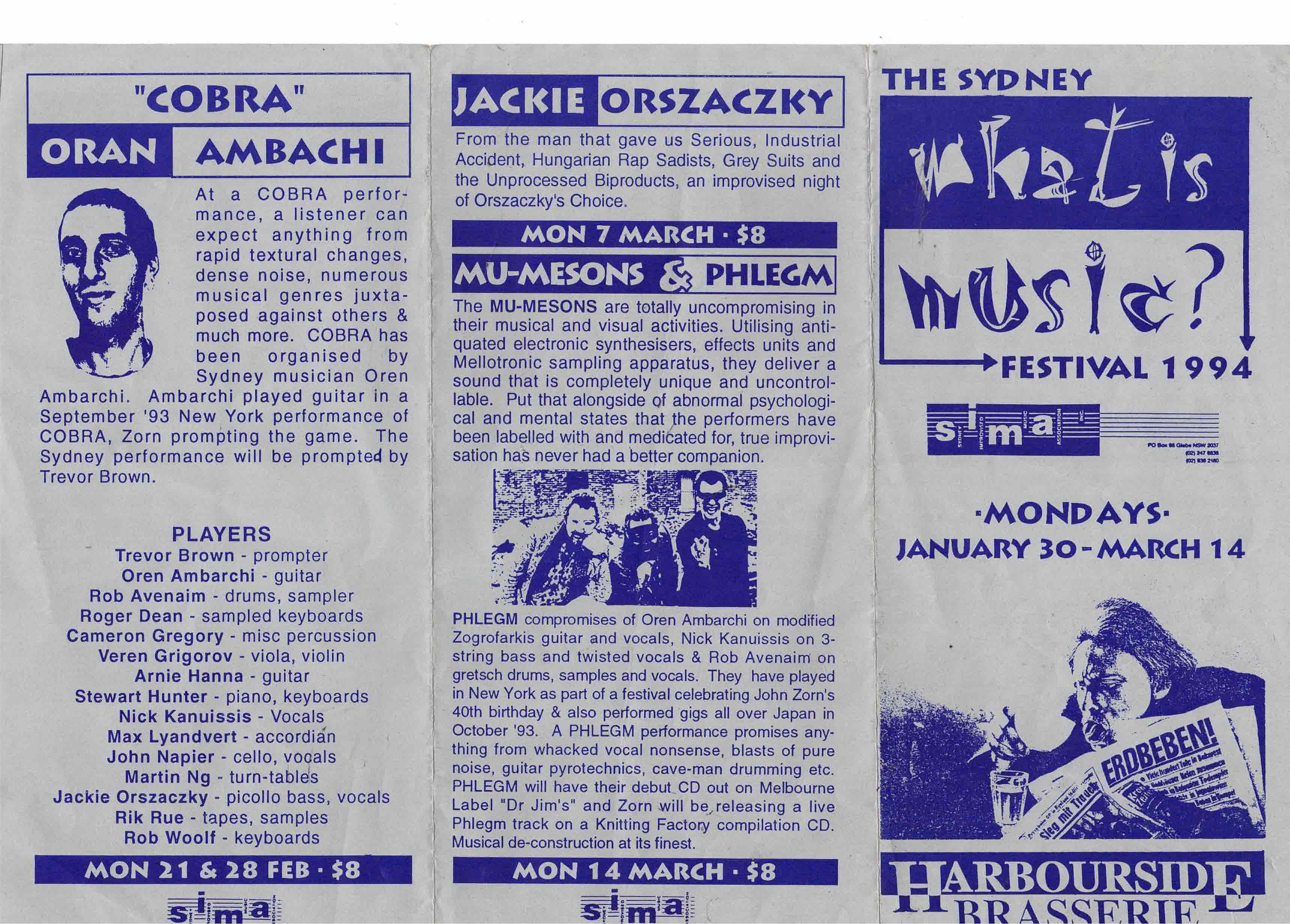 Later, Robbie had the idea to play John Zorn’s improvisational game piece Cobra back home with an Australian ensemble. At the time there was this jazz club called the Harbourside Brasserie, it was in The Rocks. The guy that ran it, Glenn Wright, let us put on experimental gigs, so What is Music? Festival began as a five-night event in Sydney in 1994. It expanded very quickly. We wanted to include everything from super highbrow compositional works to outsider artists. Introducing under recognized artists who has been working for a long time in this country such as Machine For Making Sense, The Mu-Mesons, Louis Burdett, Daevid Allen, Lucas Abela, Greg Kingston, Joyce Hinterding, Gary Butler, and Amanda Stewart.