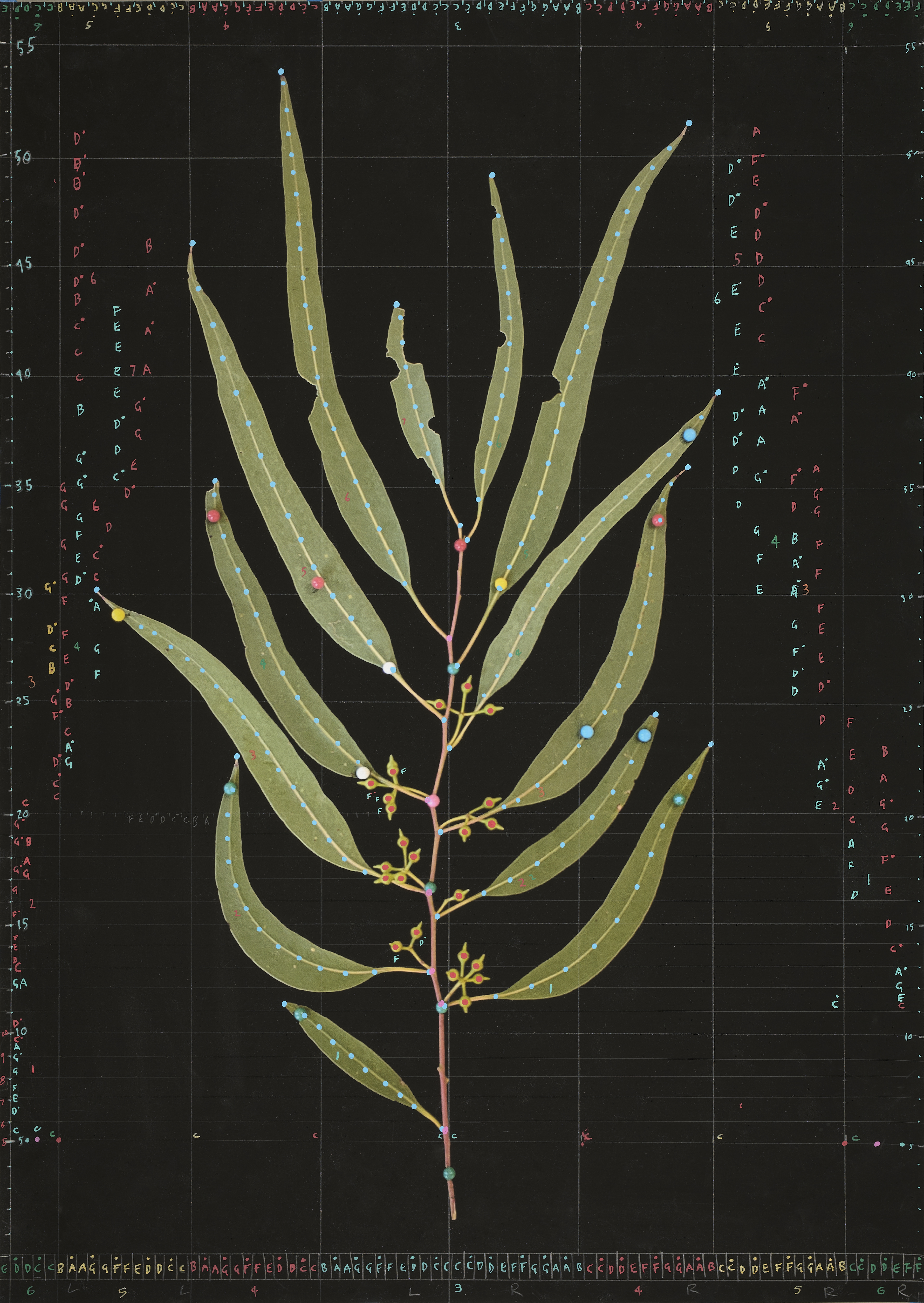 Dylan Martorell explores the relationship between organic form and structure in diagrammatic line drawings which take plants as the basis for musical scores. In this score the shape of a eucalyptus — which was found at Abbortsford Convert in Narrm — is plotted onto a grid, the horizontal scale representing sound, the vertical time. Different points on the leaf are studded with coloured dots which function as musical markers.
