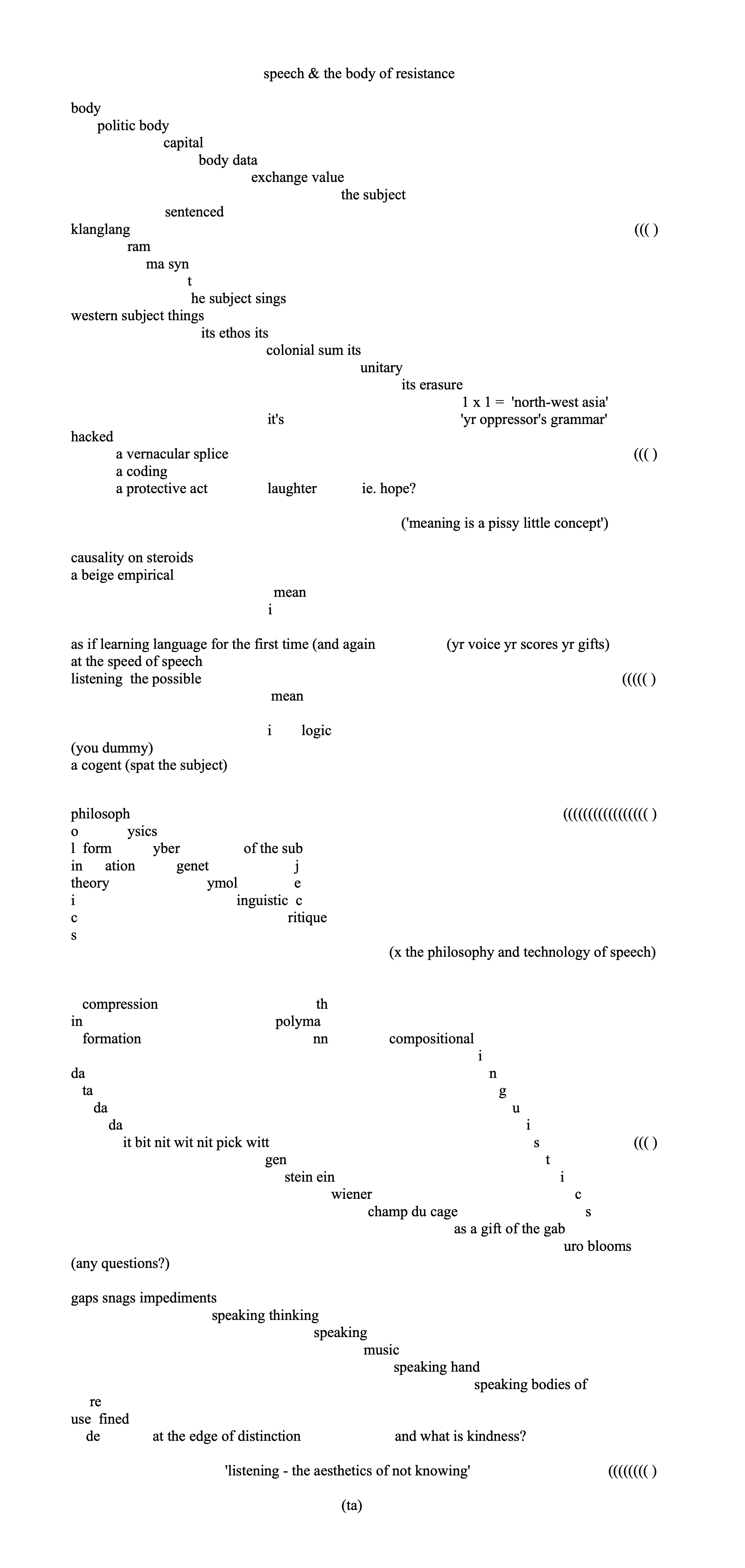 Amanda Stewart is a poet, author, and vocal artist. She has created a diverse range of publications, performances, film and radio productions in Australia, Europe, Japan, and the USA, working in literature, new music, broadcasting, theatre, dance, and new media environments. Amanda collaborated with Chris Mann for many years in the Australian ensemble, Machine For Making Sense (with Jim Denley, Rik Rue, and Stevie Wishart), as well as in other contexts. Her poem ‘ta’ was written in honour of Chris Mann’s extraordinary vision and work.