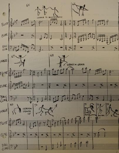 For me, this meant that in the process of transcription I had to find a clear way to communicate the Ito’s key conceptual relationships to the performers, which I did using a combination of hand-drawn still frames (whenever possible copied directly from Teiji’s own score fragments), and simple text instructions. In order to keep the amount of information on the page manageable, this also meant stripping back the musical notation to bare essentials. Interestingly, the result bore a close resemblance to Teiji’s own scores, although this was less of a priority for me, as I saw the score primarily as a document that would allow the most faithful recreation of the soundtracks in live performance.