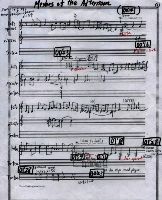 Ito was a genius at bringing together seemingly opposing ideas: freedom and playfulness were planned to the split second, the relationship between image and sound (and the resulting affect created by the fusion of the two) were always paramount. Ito never made background music for films: his pieces work together with images to create something more than the sum of its parts. He played often with the idea of synchresis, the (apparent) causal relationship between sound and image; a blend of synchronous and synthesis. A set of examples used to dreamlike effect can be observed in Meshes of the Afternoon: a Japanese drum linked to the disappearance of a hand that holds a flower, reappearing later playing a traditional hyoushimaku (clapping sounds with a wooden clapper at the opening and closing of a kabuki stage curtain), a rhythmic motif matched to a key bouncing downstairs. The drum shifts uncannily in its role: both the sound of a key hitting the ground and a musical element at the same time (both inside and outside the image on screen, neither diegetic nor non-diegetic). This slippage is apparent in all elements of the soundtrack (although crucially, not all elements performing the same function at the same time).