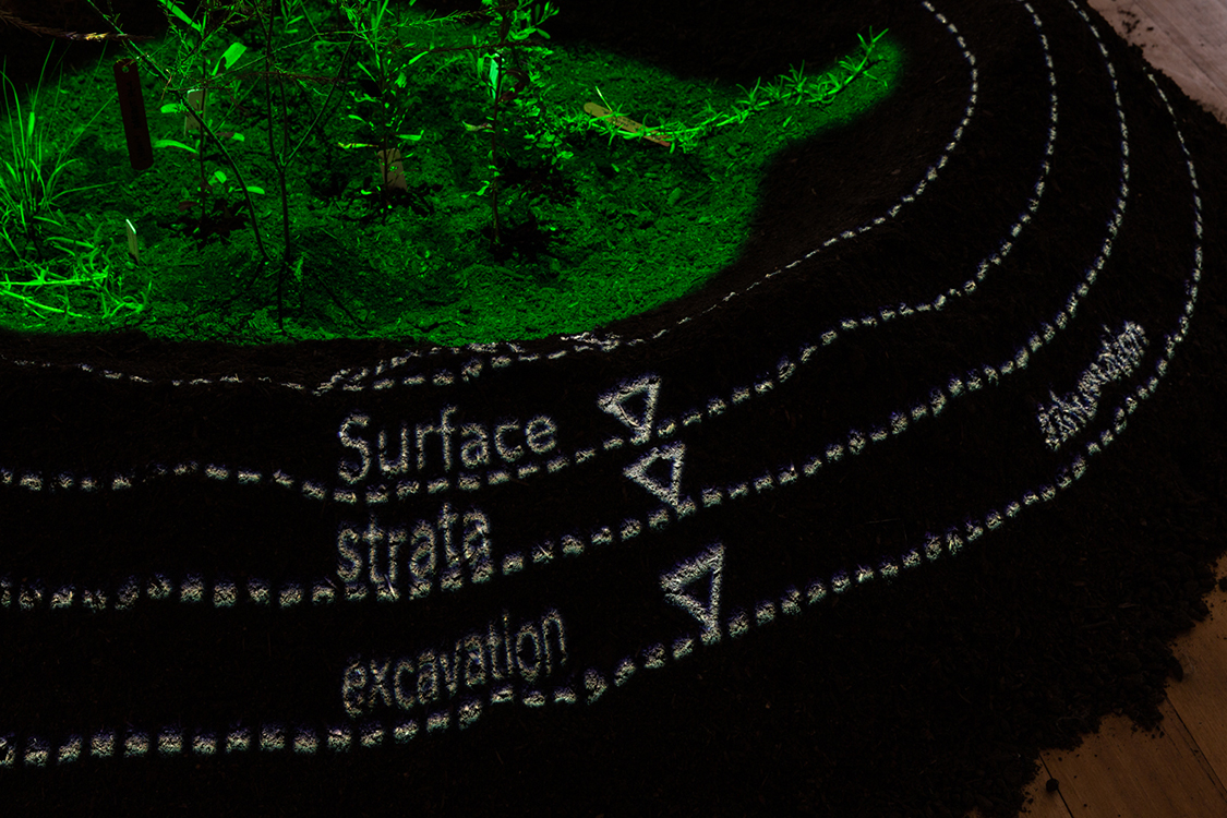 When you’re trained as an archaeologist, most of what you’re doing is digging, which is what you could call an exploration site. You would try to find something in the soil, not the soil itself. We are looking for treasure, or human remains in some instances, or some kind of object. But we are not that focused on the medium of the soil itself. So in a way, from an archaeological perspective, the exhibition was a way to reimagine how we could use soil as a place, or a site, that nourishes things. In each of our mounds there are these collections of plants that grow throughout the exhibition, or hopefully grow throughout the exhibition, and survive and thrive in it. There’s also this fabric of memory that’s embedded in the soil, and we can’t touch it, because it doesn’t form an object. It’s just accumulations of many, many generations of decay that have resulted in nutrients that then give these plants life. So in terms of your question, directing the audience towards that intimate relationship with soil, that’s one way that it happens.