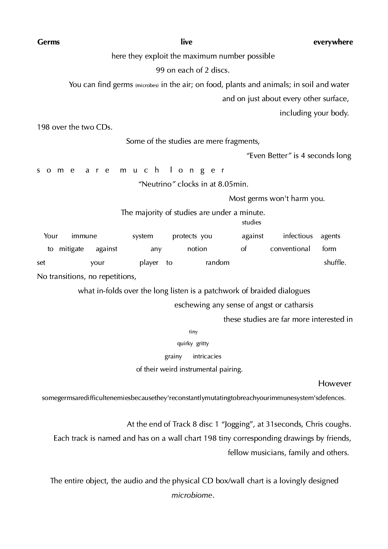 When Germ Studies perform they face each other with instruments between them. Differences between the ancient zither and the FM synthesis of the DX7 are extreme. The synthesiser accesses unlimited, algorithmic, electronic energy, while Clare’s vibrations are entropic — unless she adds extra gestural energy, strings vibrating and objects bouncing on or between strings, for instance chopsticks, will always slow and fade. A lot of what Clare does with her instrument is more physics than physicality — she’s constantly setting little experiments to do with balance and meta-stabilities. The potency of this work is generated by the fact that Clare and Chris’ sounds are entangled, but that the differences mean that they never merge, like a binary star system. On one of the longer tracks, number sixty-four, disc one, ‘Neutrino’, the music goes into a long flat loop where the DX7 provides a dullish thuddy bass, and Clare extracts all the potential noise from a very loose string flapping against the wood of her zither. In this section they are braided together musically but like two stars in a binary system that are inextricably linked, the space between the two instruments remains a chasm. I’ll borrow some words from philosopher Karen Barad — the recording becomes a diffraction apparatus, ‘in order to study the entangled effects differences make’.1