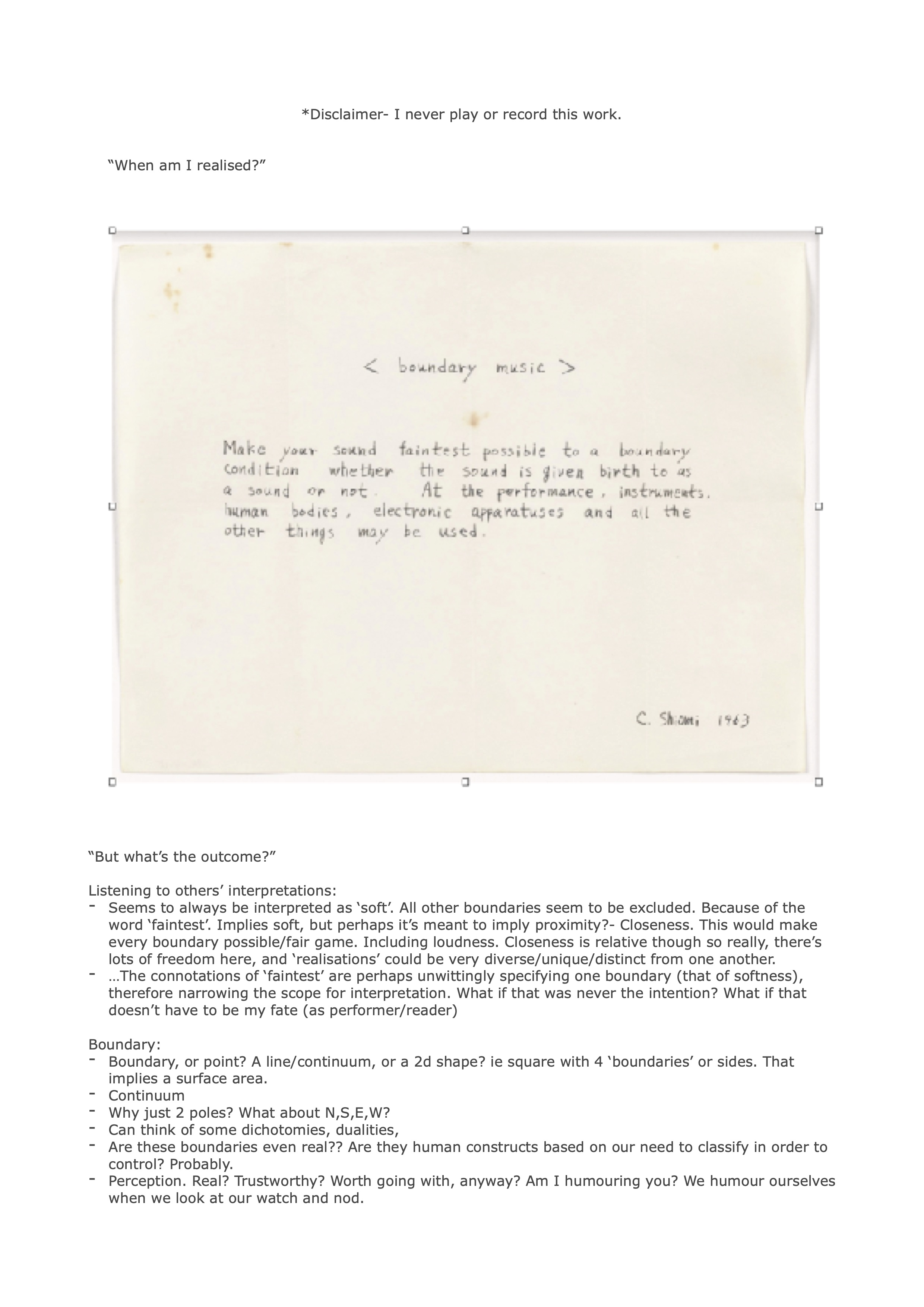 Also the other aspect of this which I picked up from my discussion with Kathy Pisaro was, how the score can include ‘non-professional’ musicians as interpreter. From the way Kathy was talking about this, I had a sense that one can only interpret the score with the instrument that they were trained on, rather than if one wanted to sing one note from the favourite score, even if they were, for example, a trained cellist.
